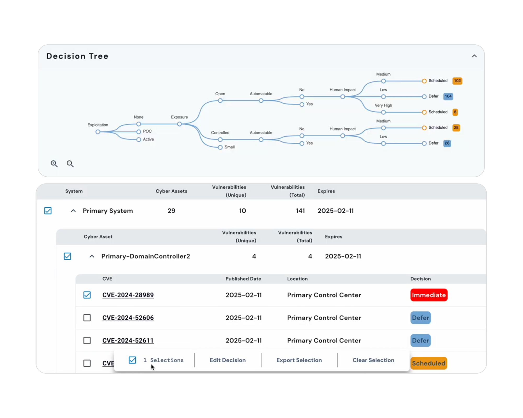 Each vulnerability is evaluated using SSVC decision criteria, including exploit maturity, system exposure, safety impact, and operational consequences.